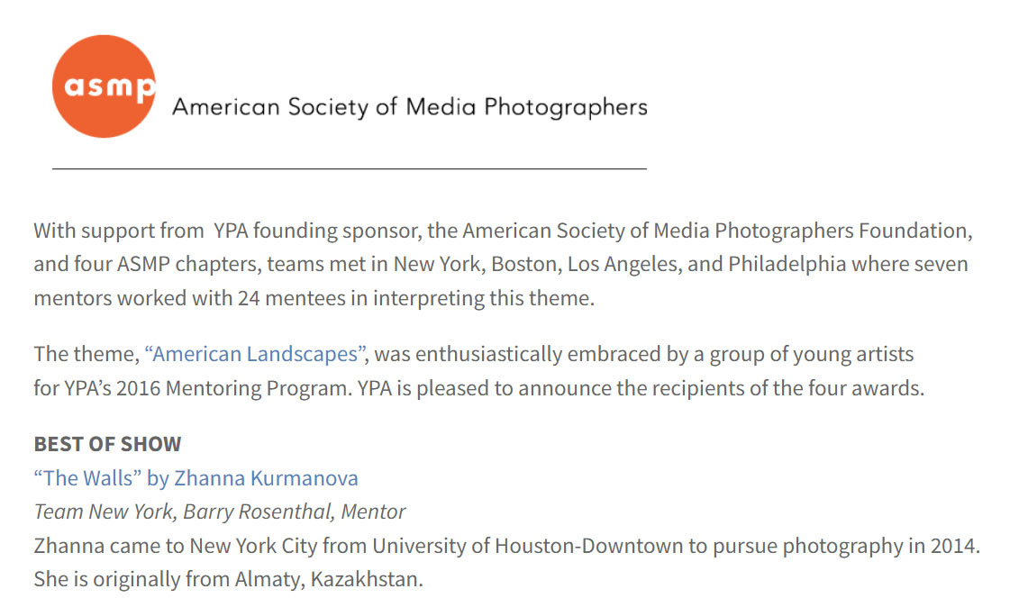 In 2016 she was awarded by American Society of Media Photographers as "Best of Show" for her project "The Walls".